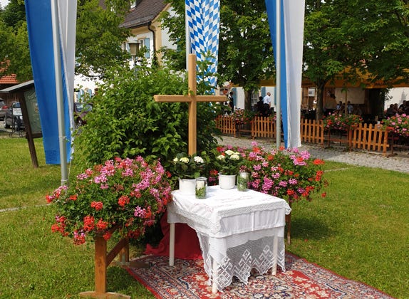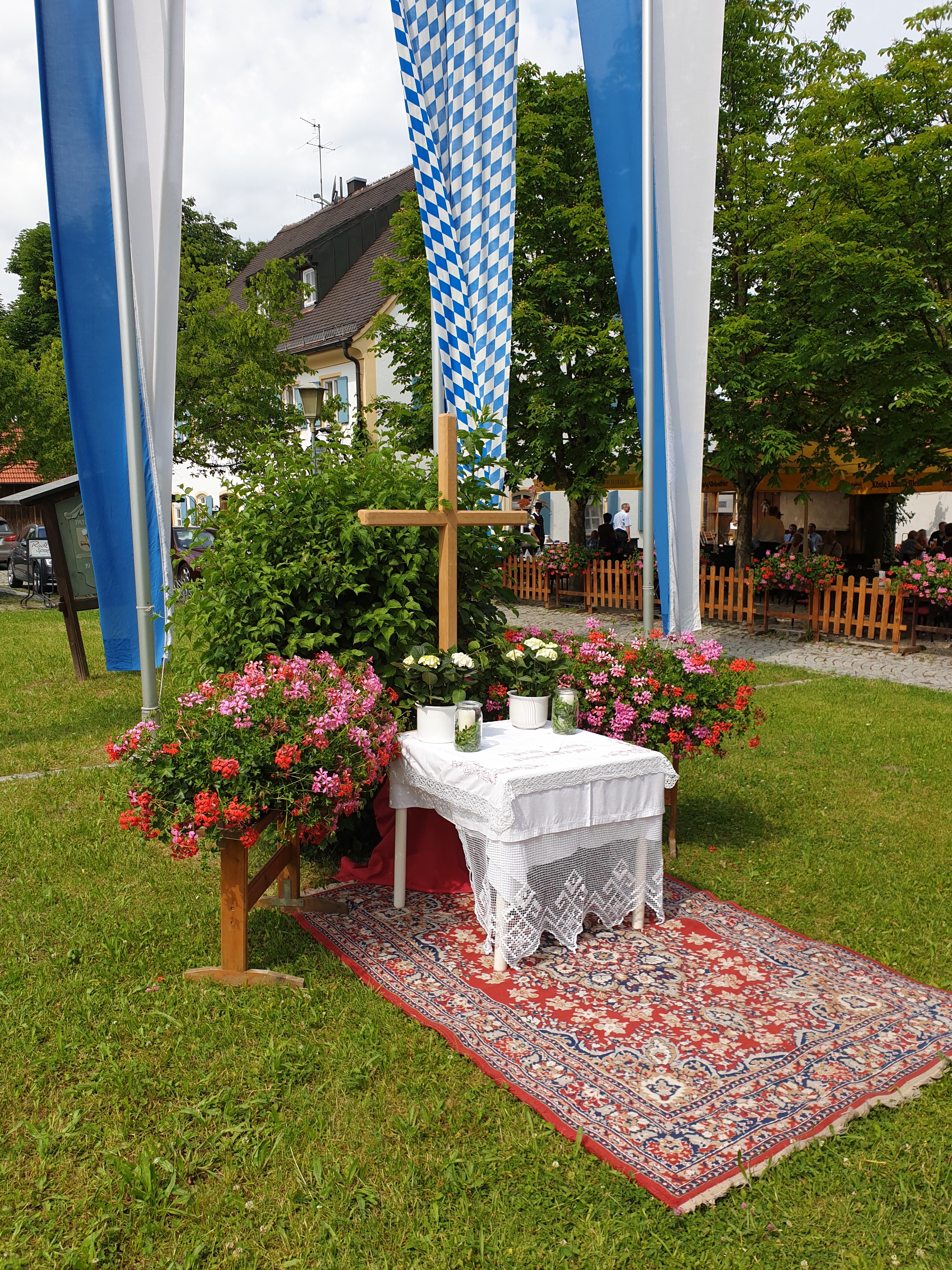Ähnlich wie bei der Marienmesse macht uns auch an Fronleichnam das Wetter einen Strich durch die Rechnung, dachte zumindest der ein oder andere. Somit wurde die Prozession abgesagt und dafür der Gottesdienst etwas verlängert. Leider oder zum Glück kam dann doch die Sonne raus, so dass wir zumindest die gemeinsame Einkehr beim Alten Wirt genießen konnten. Vielen Dank an diejenigen, die den vom Trachtenverein aufgebauten Altar so herrlich geschmückt hatten. Vielleicht ja nächstes Jahr…